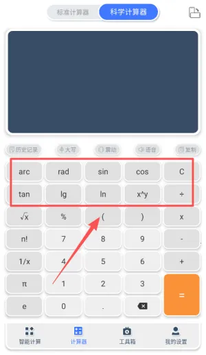 4、遇到公式计算可切换科学计算器模式,三角函数、对数计算都能直接输入生成答案。