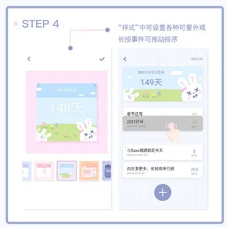 “样式”中可设置各种可爱外观,长按事件可拖动排序。