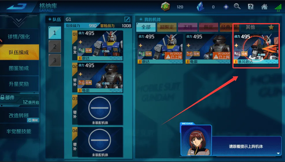 3、想要编队出战,可以在格纳库进入队伍编成,从我的机体列表里选择机体,根据指引上阵就可以。